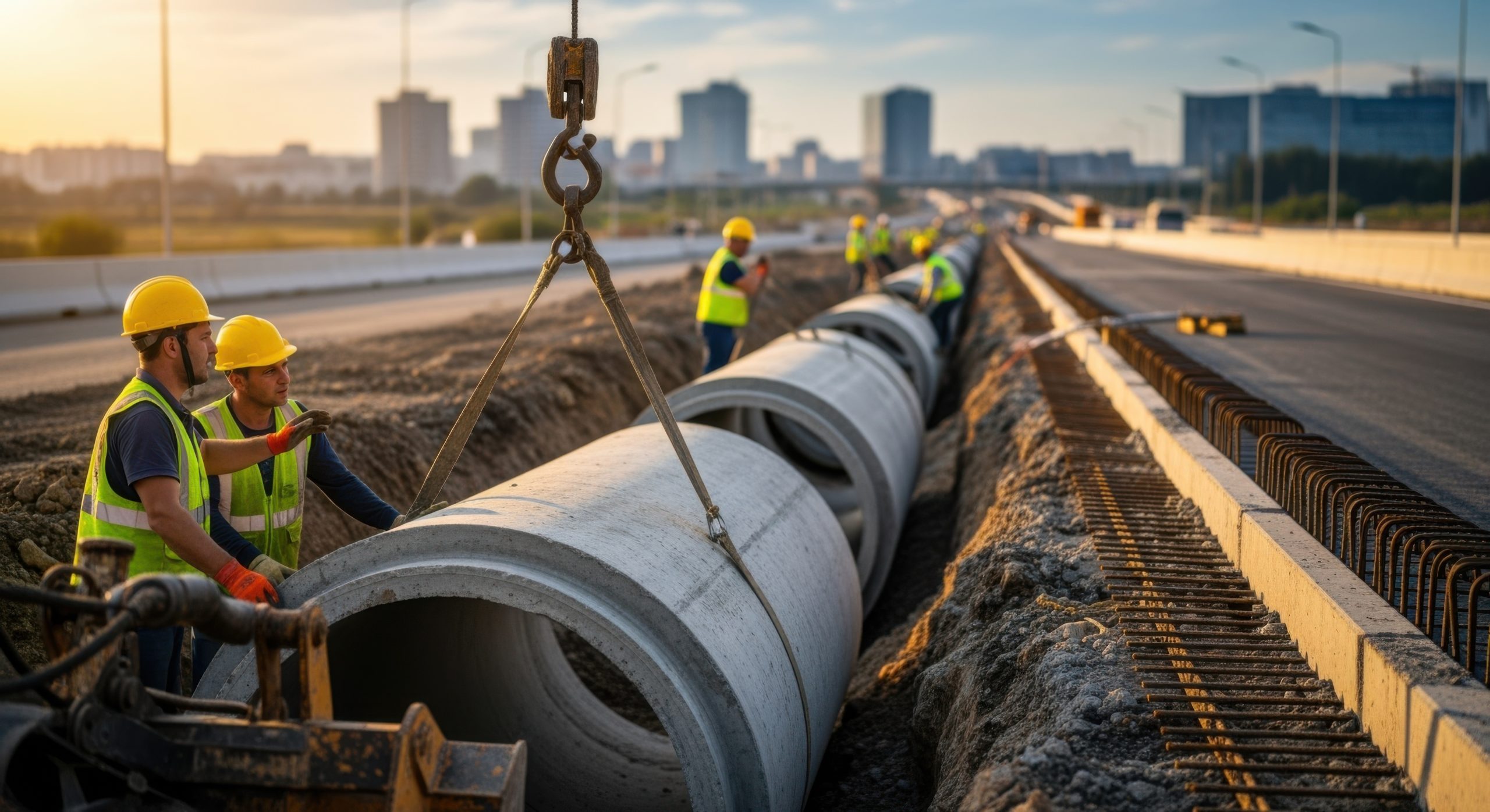 Construction of roads, bridges, foundations, drainage systems, and public utilities with an emphasis on durability and sustainability.